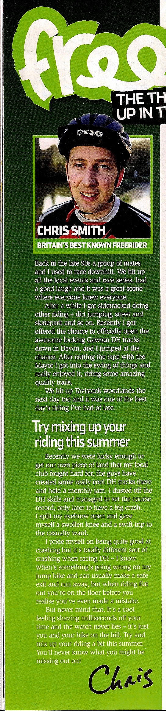 That's right kids, the dude in the photo looks like a younger skinnier Chris Smith. Well it is! In between his contracted 3 out of every 4 cover shots for MBUK Chris manages to write a column about being 'Britain's best known freerider'.