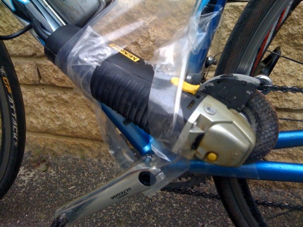 If you look closely you can see how Neil carefully strapped the grinder to his bike, a mod that went unnoticed at the start of the event.