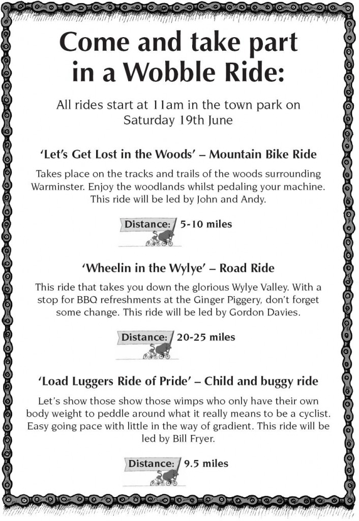 The Warminster Wobble is a local cycling event which takes place over two days in National Bike Week. Last year brought the first edition of the Wobble with great success and long may it continue!