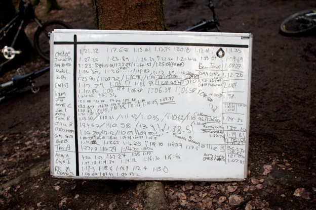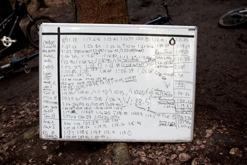 Sam Chedgy managed to put in an good early time that meant he was fastest for the first quarter of an hour, but it wasn't long before some more riders started penning up their times and the board started to fill up... Curtis Saunders struggled to get to grips with the idea of non-bermed corners as he managed to come off his bike on almost every run due to his kamikaze like corner commitment. Ben Irons suffered a mechanical right at the start meaning that he was reliant upon the generosity all day so had his work cut out. Chris Smith put in some fast times right from the start, but then decided to play cat and mouse rather than over exert himself, something he may now be regretting. Liam Arkell was, as has come to be expected, flying up the leader board with his Pocket Rocket style and ability to chip away every run. I was off the pace except for one flying run, only to find out that the watch hadn't recorded a time, gutted, Steve Corner impressed on his first ever TickerTape, looking to improve and learning fast. Andrew Armstrong also managed to put in a great performance in his first TickerTape taking 15 seconds off his time and giving his son a run for his money too. Chris Marsland put in some fast runs and looked suitably retro (as always) before racing Simon Truelove in a pump race in tribute to Chris' home from home, Bath BMX . Ric Mclaughlin chickened out of wearing the MBUK skin suit but seemed to be having a great time racing his test Moerwood. Ric's done two TickerTape special events now (Triple Crown and Retro) so he was familiar with the set-up and soon managed to take over 7 seconds off of his time. With over 30 riders competing the board managed to fill up pretty quick and has become an almost unreadable mess (hence the lack of results spreadsheet from me so far), thankfully Calum's groupies didn't want to race or else we would have needed to use the blackboard too.
