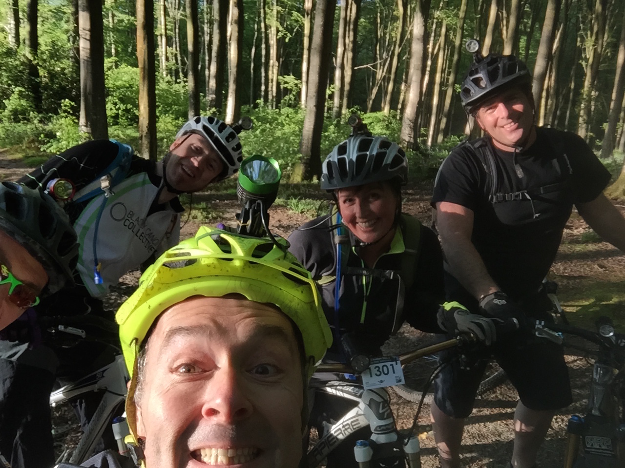 Again, faster boys, they get fixated. I made the mistake of mentioning the Strava time of a local roadie up the BCC Climb to Chris as we rode along the road to it, and duly he fired straight on up at warp speed, missing the easier, more fun way on the left (why always the left?). We regroupped as 8 at the top and headed for Fencline. I say headed, 'cos whilst Diz added some air to his tyres bored minds plotted a more direct route down. Direct, loamy and bloody good fun as it turned out, which cheering from 4 chaps also out halfway down. I myself even cleared a double, on my XC hardtail with my saddle up - it was new, I knew no better and just rode it! Phew.