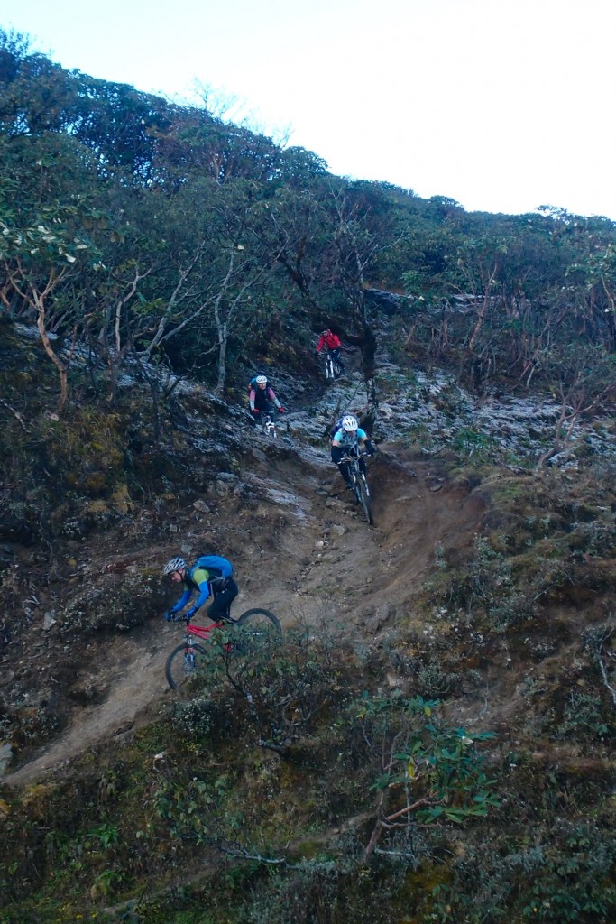 Considering the drop to our night stop, we still hadn’t dropped an inch – which meant that things could only go one way, down. We’ve all got a favourite trail, and we’ve all had one of those days where everything comes together and you ride like a trail god. Today was one of those days where both come together. Checking in at an Army checkpost (they dot the border with Nepal, and as we’d crossed over, passports needed to get back!) and then tea and mo mo’s in a Sherpa hut gave us a chance to rest and check out the trail ahead. Starting above the treeline, we would be following a trail down into the forest and around 11km and 1800m lower our stop for the night. I’ll say this again – an 11km singletrack descent. There’s a way to ride virgin trails, flat out! Slow down and you hit every root and rock, get to the right speed and you glide over. The mental toll of this type of riding is perhaps more than the physical (we were riding blind, so had to be super focused on every turn and drop) , so we quickly adopted a system where the faster of us swapped the lead every couple of minutes, that way we kept it pinned, and barring a flat or two we kept a quick pace to the bottom. And what a trail! Doubt it had ever seen a tyre, but centuries (or millennia) of feet and hooves had done a good job of sculpting an amazing trail.