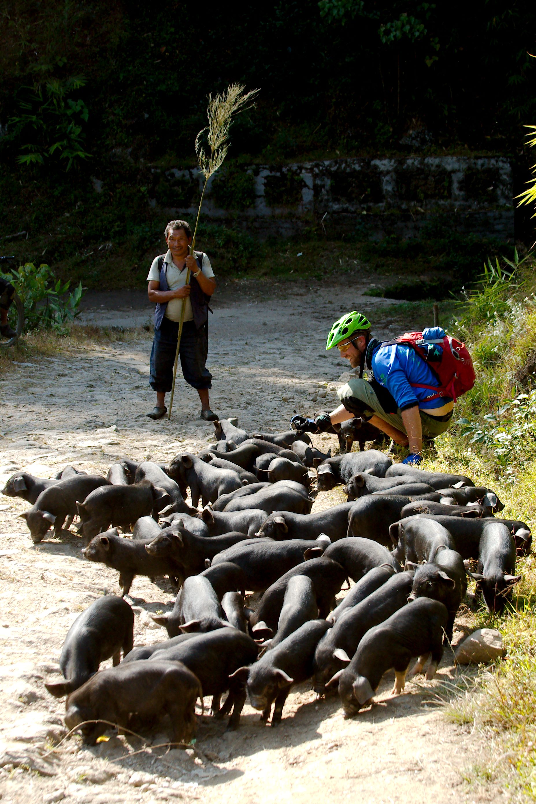 But what downhill would be a downhill without a sodding big climb first, this time so we could re-visit Tiger hill. From the top, after soaking up the views we dropped into slippery singletrack, so slippery in fact all of us took multiple spills, back into a small village we negotiated impossibly steep tracks and steps, much to the bemusement of the locals – here on in it was a full day of blasting through the forest, dodging pigs, eating more mo mo’s (collectively we must of eaten hundreds by now), and progressively shedding layers